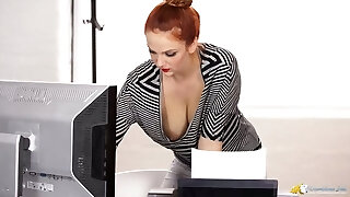 Amazing auburn secretary Aston Wilde exposes her gullet-watering boobs