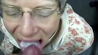 Nerdy cougar diligently swallows heavy cock until happy ending on face
