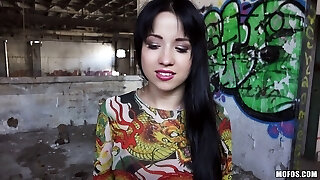 Colorful Russian doll sucks a cock in public for some currency