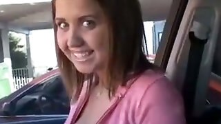 Happy young babe in the car flashes her gorgeous tits