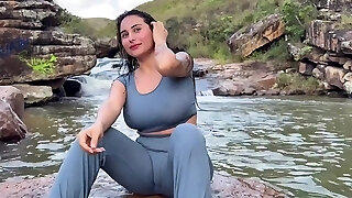 All alone beautiful huge-titted babe Milla masturbates her puss near the pond